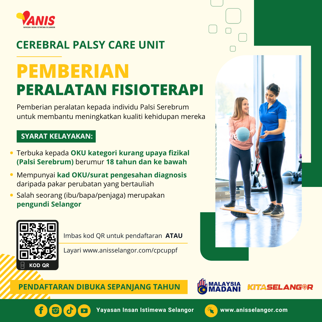 Melalui inisiatif ini, Jabatan ANIS menawarkan bantuan pemberian peralatan fisioterapi kepada golongan yang memerlukan, khususnya individu dengan Palsi Serebrum. Matlamat ANIS adalah untuk memastikan mereka mendapat akses kepada peralatan yang dapat membantu mereka menjalani kehidupan yang lebih aktif dan bermakna.